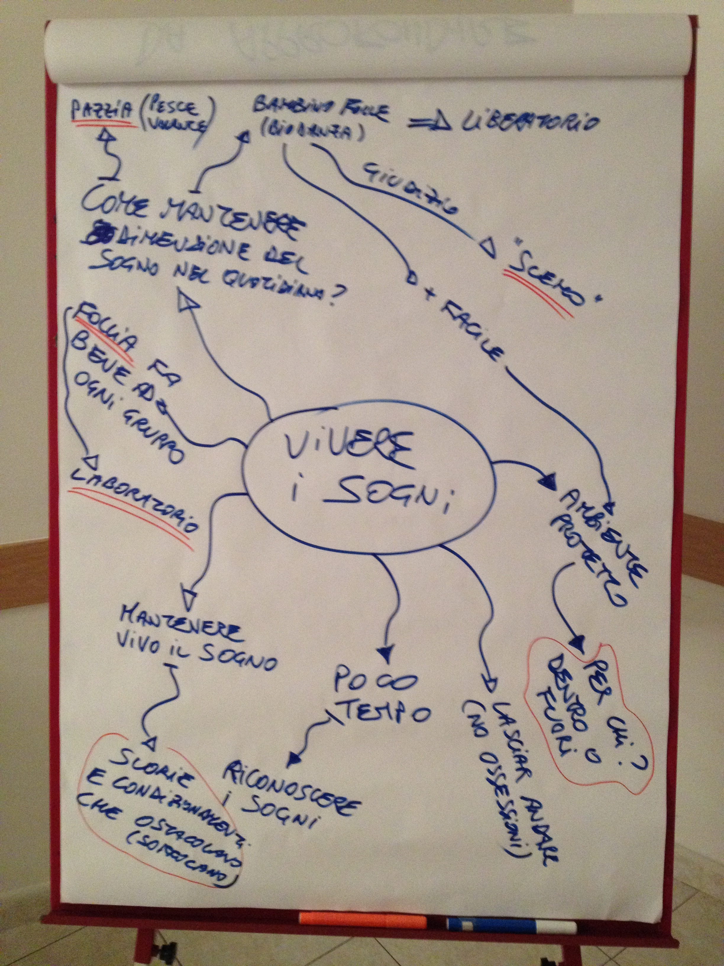 Gli interventi erano principalmente su due piani. Il primo è stato quello che permettersi di vivere i propri sogni, i propri desideri. Il secondo è stato quello del mantenere un spazio per la dimensione del sogno nel quotidiano. Questo secondo aspetto è quello che abbiamo maggiormente esplorato e che ha portato a riconoscere l’elemento della “sana follia” come ingrediente importante per una persona e per un gruppo evolutivo.