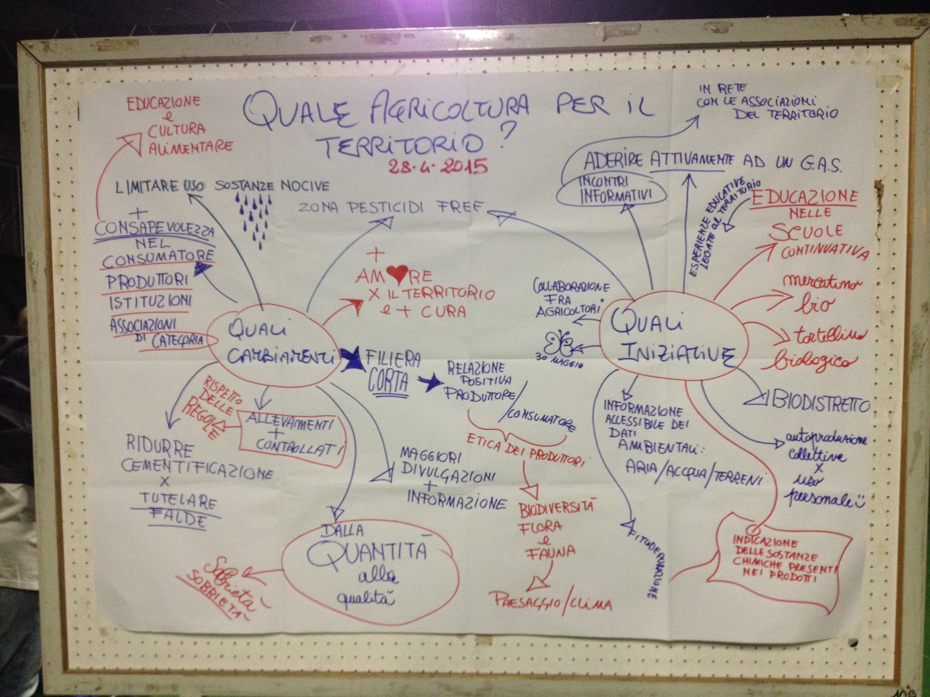 Il tema era espresso dalla domanda “quale agricoltura per il nostro territorio?”. Le domande specifiche che abbiamo utilizzato per approfondire l’argomento erano finalizzate ad esplorare i cambiamenti necessari per una agricoltura che favorisca maggiormente salute, ambiente ed economia locale.