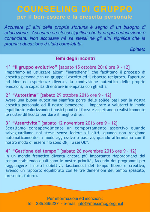 Counseling di gruppo 4 incontri di Counseling di gruppo per il Bene-essere e la Crescita personale . A Bologna in Ottobre e Novembre 2016. Counselor Massimo Giorgini . Condividi: Condividi su X (Si apre in una nuova finestra) X Condividi su Facebook (Si apre in una nuova finestra) Facebook Mi piace Caricamento...